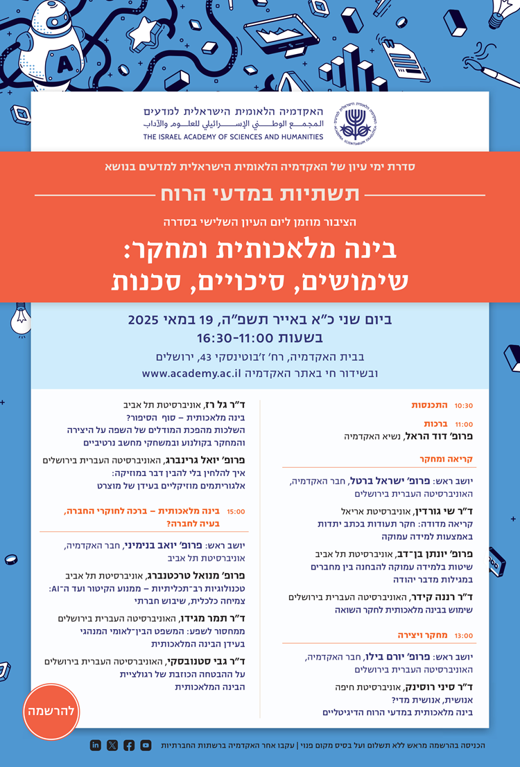 יום העיון השלישי בסדרה "תשתיות במדעי הרוח" | בינה מלאכותית ומחקר: שימושים, סיכויים, סכנות