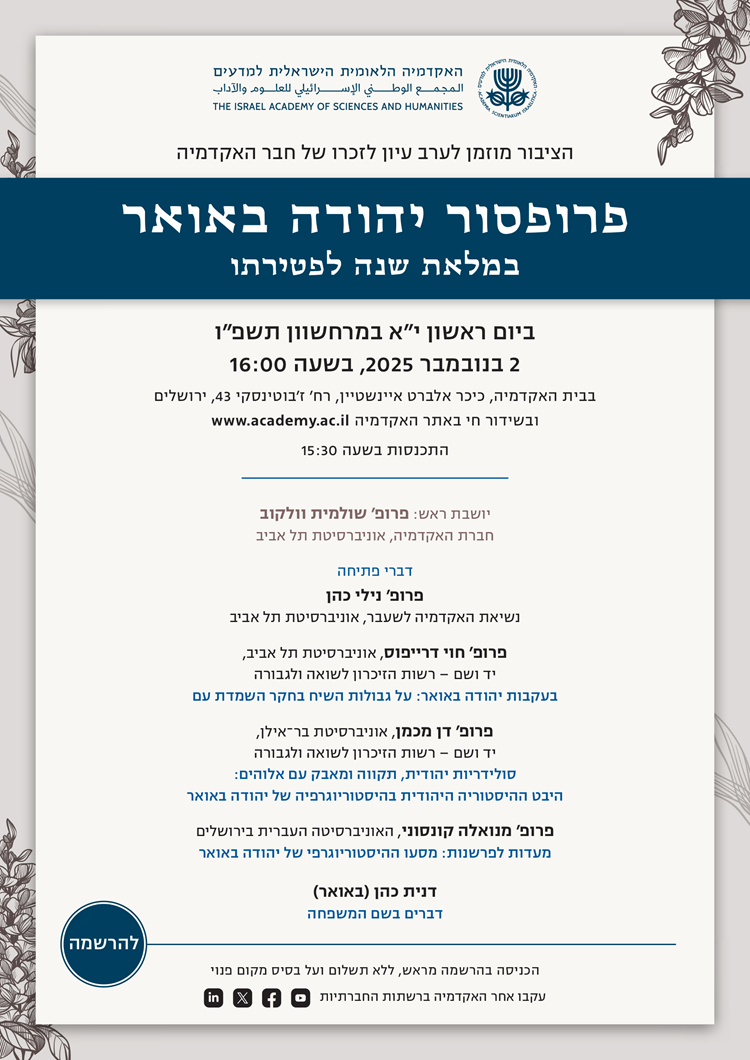 ערב עיון לזכרו של חבר האקדמיה פרופ' יהודה באואר במלאת שנה לפטירתו