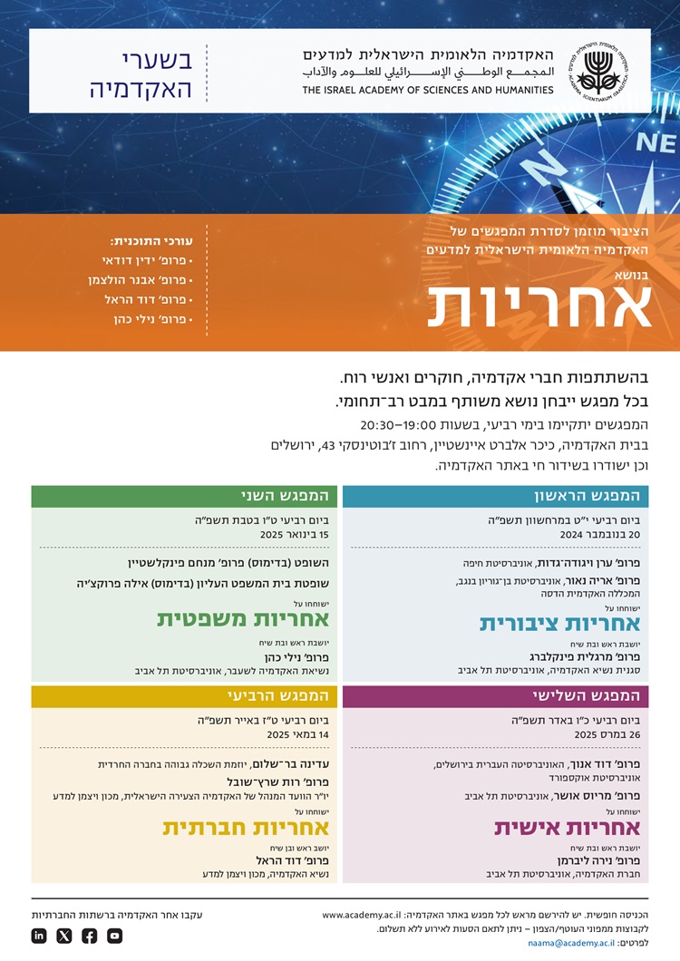 האקדמיה מזמינה אתכם לעונה העשירית של סדרת המפגשים ״בשערי האקדמיה״. בכל שנה מתמקדת הסדרה בנושא רב־תחומי אחר, והשנה תעסוק בנושא "אחריות".