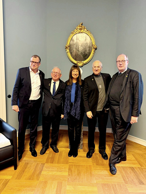 מימין: נשיא האקדמיה למדעים של ברלין־ברנדנבורג, פרופ׳ כריסטוף מרקשיס, נשיא האקדמיה פרופ' דוד הראל, נשיאת האקדמיה לשעבר פרופ' נילי כהן, מנכ"ל GIF מר אריק צימרמן, ונשיא האקדמיה הלאומית הגרמנית למדעים לאופולדינה פרופ' גראלד האוג