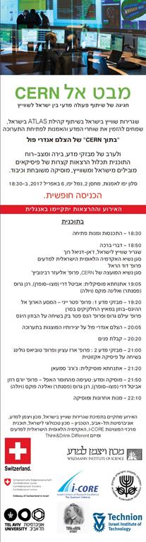 פתיחת התערוכה "בתוך CERN" של הצלם אנדרי פול וערב של מבזקי מדע, בירה ומצב-רוח; התכנית תכלול הרצאות קצרות של פיסיקאים מובילים מישראל ומשווייץ, מוסיקה משובחת וכיבוד; האירוע וההרצאות יתקיימו באנגלית