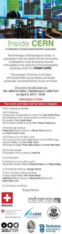 Opening of the photography exhibit by Andri Pol: "Inside CERN"; talks by top Swiss and Israeli physicists, accompanied by music and food