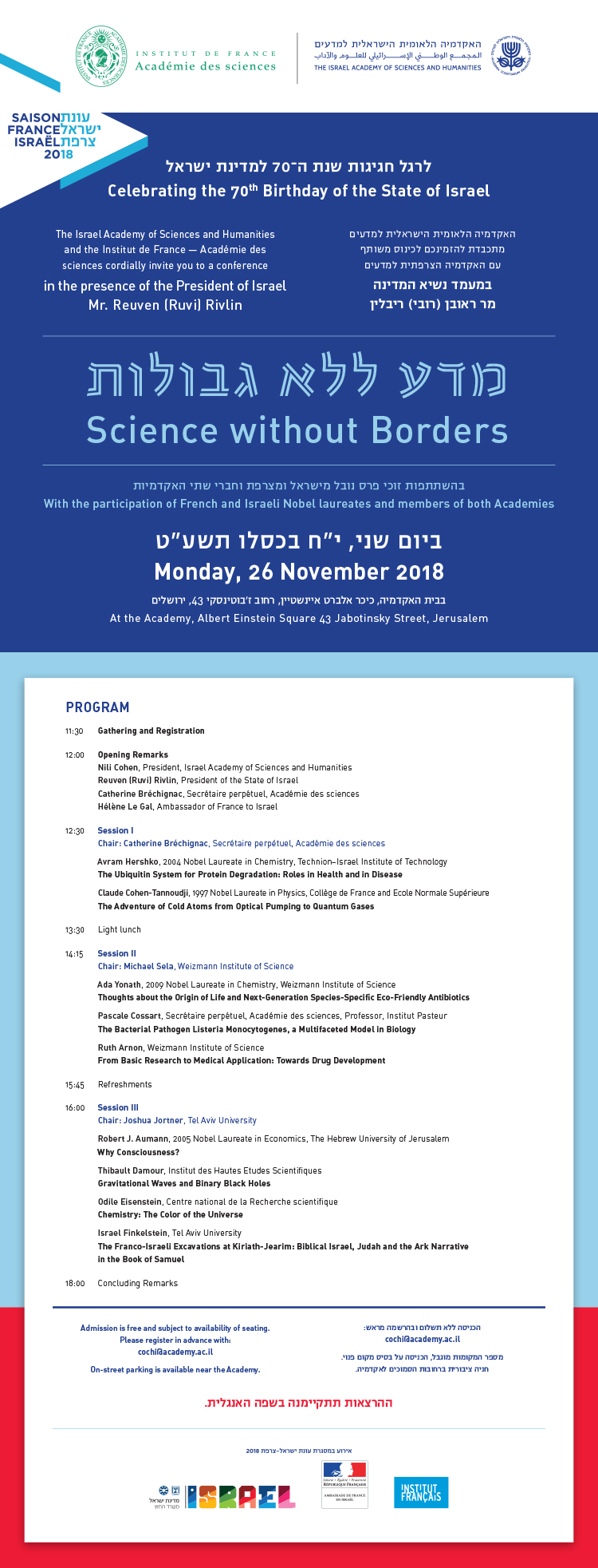 את הכינוס הובילו נשיאת האקדמיה פרופ' נילי כהן והמזכירה הקבועה של האקדמיה הצרפתית למדעים פרופ' קתרין ברשיניאק (Catherine Bréchignac), במעמד נשיא המדינה מר ראובן (רובי) ריבלין ושגרירת צרפת בישראל גב' הלן לה-גאל.