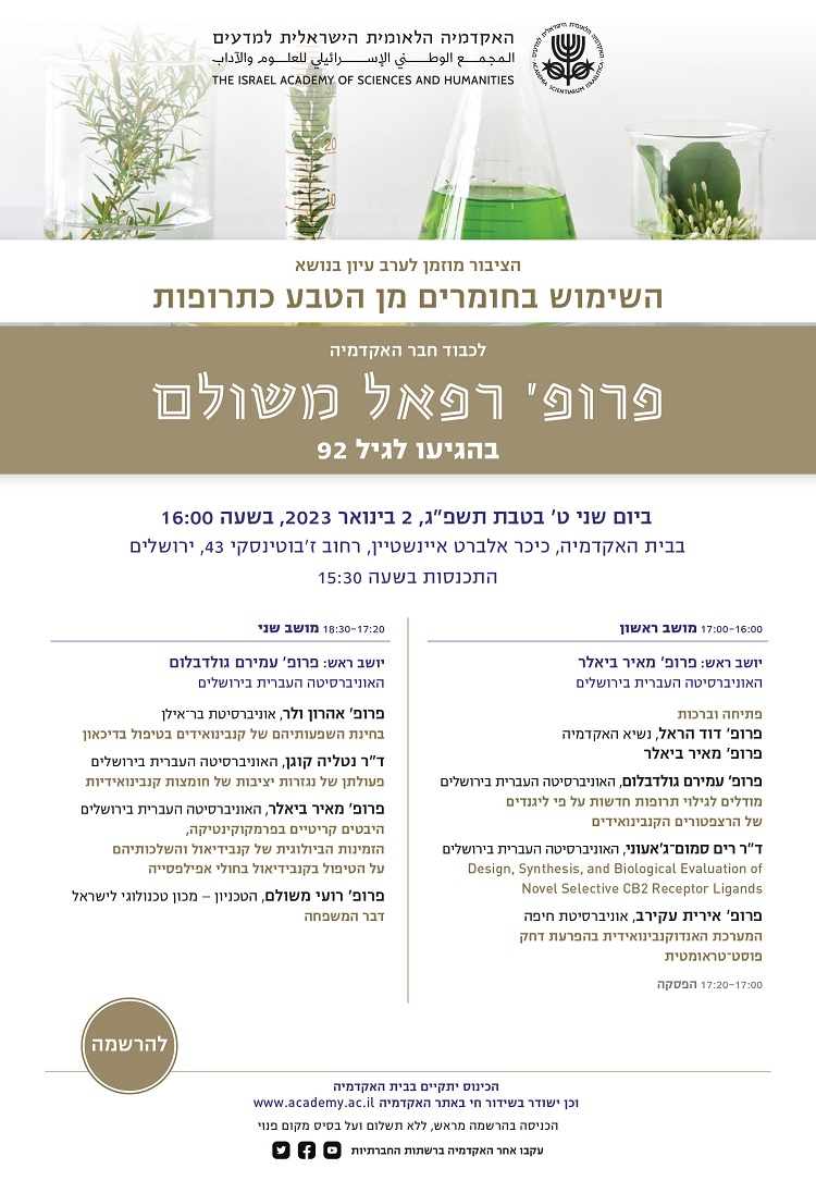ערב עיון בנושא השימוש בחומרים מן הטבע כתרופות לכבוד חבר האקדמיה פרופ' רפאל משולם בהגיעו לגיל 92