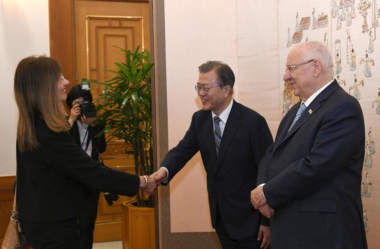 בתמונה מימין: נשיא המדינה מר ראובן (רובי) ריבלין, נשיא קוריאה הדרומית מון ג'יאה-אין ונשיאת האקדמיה פרופ' נילי כהן