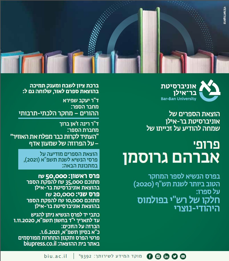 ברכות לחבר האקדמיה פרופ' אברהם גרוסמן על זכייתו בפרס נשיא אוניברסיטת בר-אילן לספר המחקר הטוב ביותר לשנת תש"ף