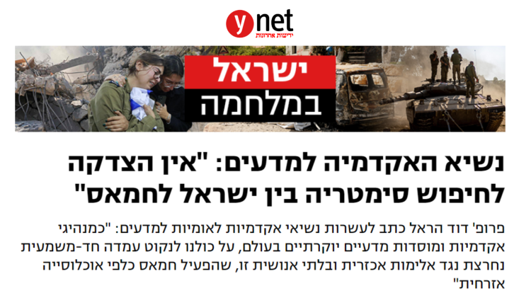 נשיא האקדמיה הלאומית הישראלית למדעים, פרופ' דוד הראל, שלח היום מכתב לעשרות נשיאי אקדמיות לאומיות למדעים וראשי ארגוני מדע מובילים וחשובים בעולם, ובהם האקדמיות הלאומיות של ארה"ב, בריטניה, גרמניה, צרפת ואיטליה. המכתב נשלח אליהם בתגובה על מכתבי תמיכה ותנחומים רבים שקיבל מהנשיאים ומראשי ארגוני המדע בעקבות המתקפה האכזרית של חמאס על אזרחים ישראלים בעוטף עזה, שבכמה מהם צוין הצורך "שכל הצדדים יימנעו מאלימות".
