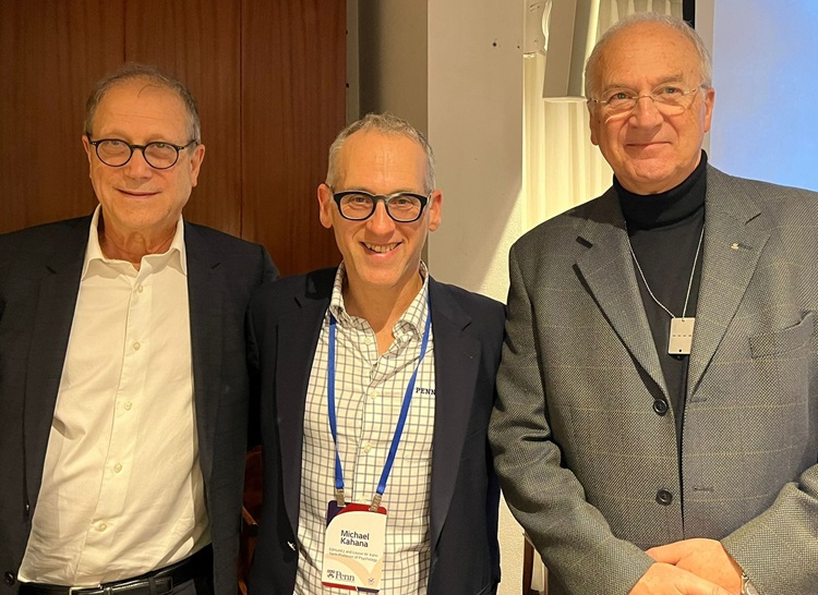 Headed by Prof. Michael J. Kahana and Prof. Peter Decherney, the delegation came to visit the academy at the initiative of Prof. Itzhak Fried, an Israel Academy of Sciences and Humanities member. During their visit today, they met with Academy President Prof. David Harel and the entire Academy Council, including Vice President Prof. Margalit Finkelberg, Prof. Sergio Hart, and Prof. Yadin Dudai, to discuss ways of supporting Israeli academia in this challenging period.