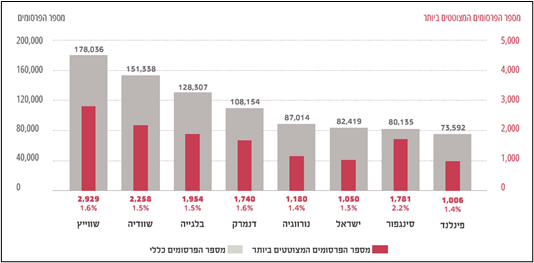- חלקם היחסי של הפרסומים הישראליים מסך הפרסומים העולמיים הולך וקטן, גם בשִקלול גודל האוכלוסייה. כמו כן ישראל מדורגת אחרונה לעומת מדינות הייחוס במדד המאמרים המצוטטים ביותר (HCP). עם זאת החוקרים הישראלים זוכים במענקים הבין-לאומיים היוקרתיים ביותר, ובהם מענקי מועצת המחקר האירופית (ERC) ופרסים מדעיים בין-לאומיים – מענקים ופרסים המעידים על מצוינותם של החוקרים הישראלים.
