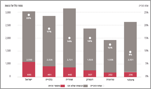 - שיעור ההצלחה של ישראל הוא הגבוה ביותר בזכייה במענקיERC של מועצת האיחוד האירופי היוקרתיים בשנים 2015–2024. עם זאת שיעור הזכיות של ישראלים במענק Starting, אחד ממענקי ERC, היה בשנת 2025 נמוך באופן חריג וירד לשפל של שמונה אחוזי הצלחה לעומת 29–32 אחוזי הצלחה בשנים קודמות.