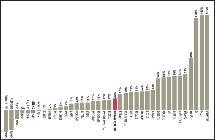 שיעור השינוי בהשקעה הלאומית למו"פ אקדמי במדינות ה-OECD (2014–2023). במחירים קבועים לשנת 2015.