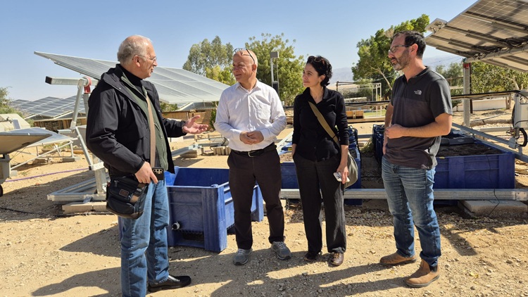 מימין: ד"ר אורן הופמן, ד"ר מירי לביא-נאמן, מנכ"ל המכון ד"ר טארק אבו-חאמד ונשיא האקדמיה פרופ' דוד הראל בביקור בחלקת הניסויים הפוטו-וולטאית במכון