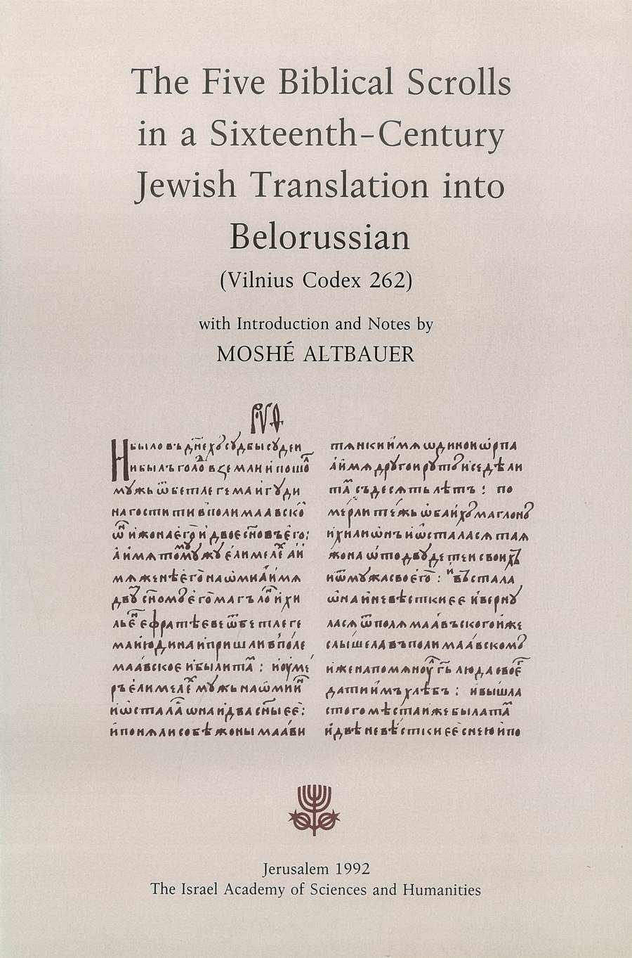 Vilnius Codex 262 contains a translation from Hebrew into Belorussian of the Song of Songs and the Books of Ruth, Lamentations, Ecclesiastes and Esther, composed just when Belorussian was emerging in its modern form. The manuscript of the Five Scrolls is displayed here in a complete photographic reproduction, accompanied by a transcription on facing pages. The introductory chapters and the critical commentary highlight the text’s distinctiveness from other, non-Jewish translations of the Bible into Slavic, and its affinity with translations into languages of the Jewish Diaspora. The last portion of the work is a complete Belorussian-Hebrew Concordance, compiled by Dr. M. Taube.